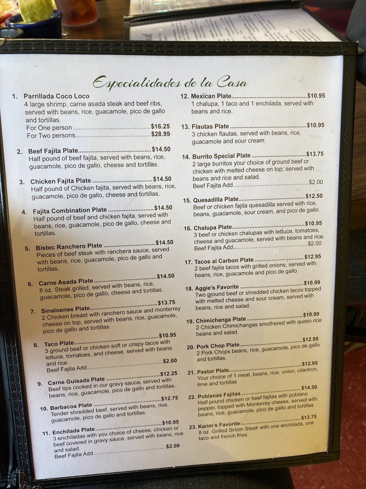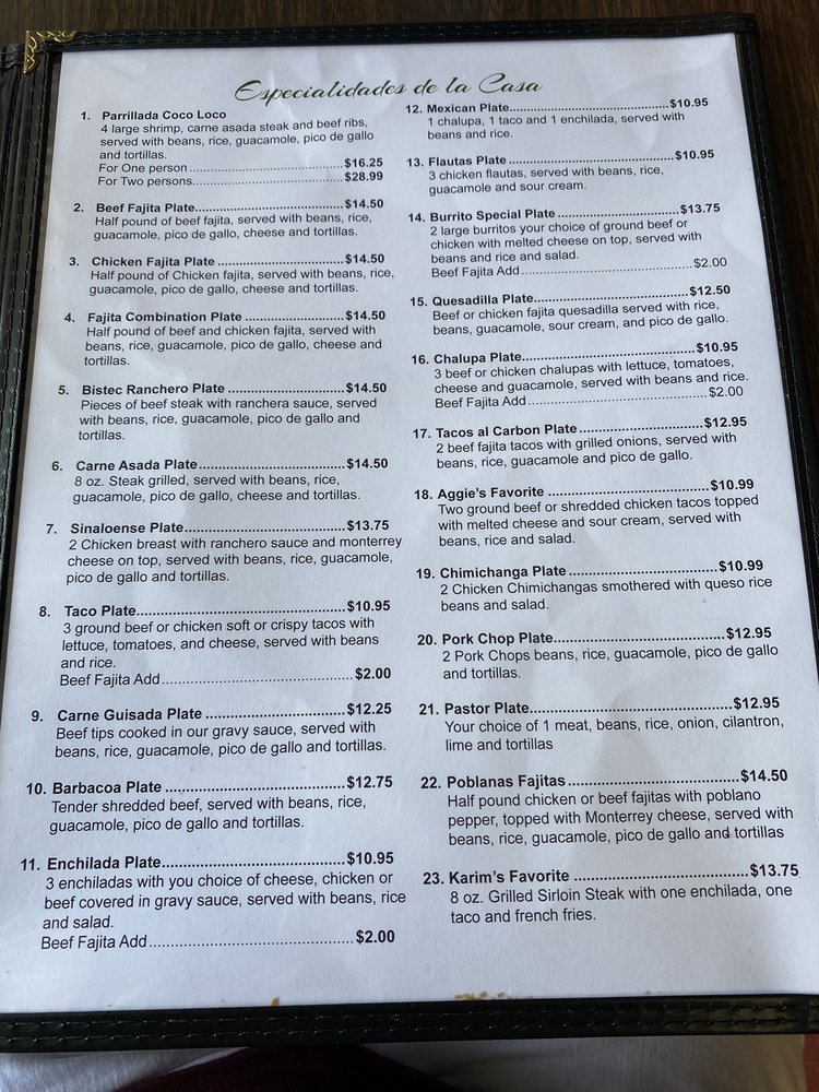 oz. Grilled sirloin steak with one enchilada, one taco and french fries.